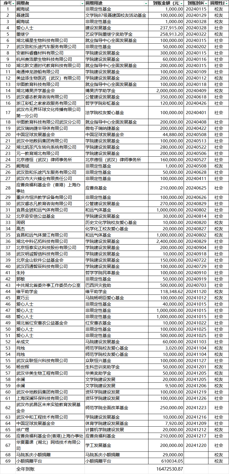 湖北大学2024年度捐赠情况统计